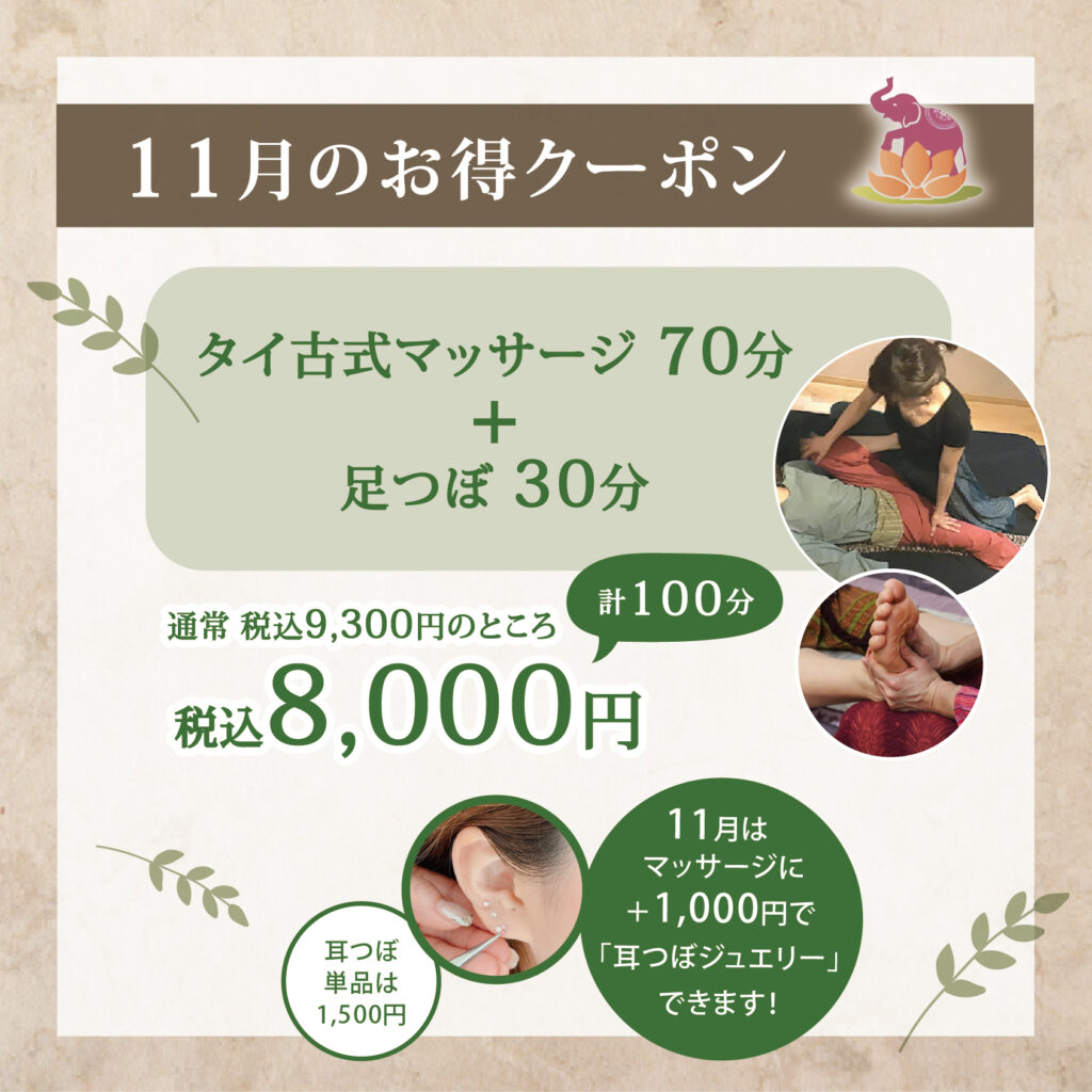 今月のお得クーポンは「タイ式70分+足つぼ30分」計100分コース。